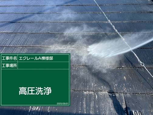 高圧洗浄機で、屋根や外壁の汚れやコケをキレイに落としております。