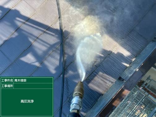 高圧洗浄機で、屋根や外壁の汚れやコケをキレイに落としております。