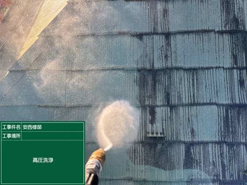 高圧洗浄機で、屋根や外壁の汚れやコケをキレイに落としております。