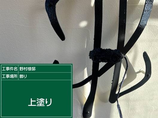 建物上部にある飾りも鉄部ですので、シャッターBOX同様にサビ止め→中塗り→上塗りの3回に分けて塗装しております。