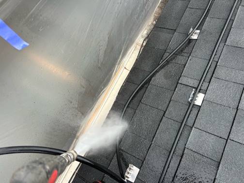 高圧洗浄機で、屋根や外壁の汚れやコケをキレイに落としております。